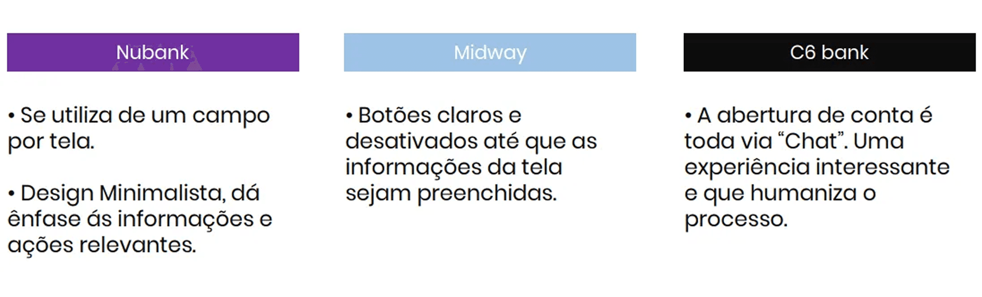 Com o objetivo de avaliar e obter referências das melhores práticas para análise e orientação na tomada de decisões, foram realizadas a observação das etapas de abertura de conta dos aplicativos Nubank, Midway e C6 Bank, destacando elementos de sucesso e aspectos inovadores.